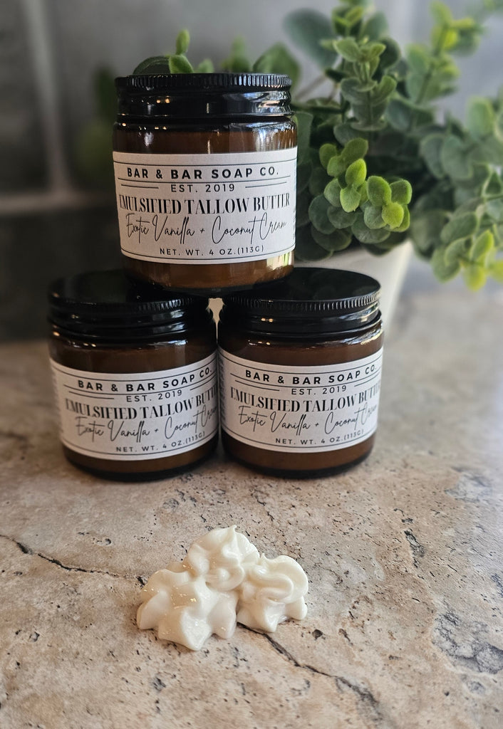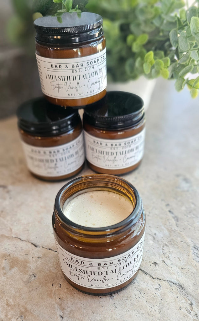 Emulsified tallow butter is a lightweight, creamy moisturizer made by blending tallow, water, and emulsifiers for superior hydration and nourishment. Unlike whipped tallow, which can feel greasy, emulsified tallow absorbs quickly, combining hydration and moisture retention for softer, healthier skin.