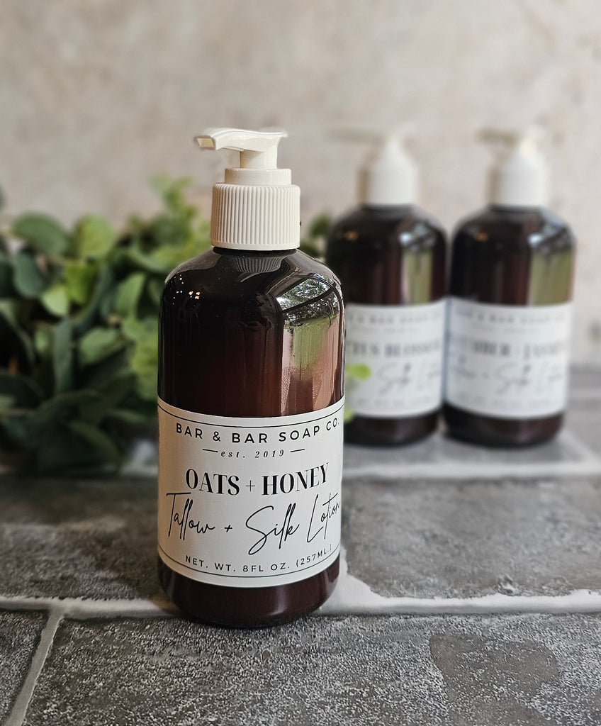 Water, Grass-fed beef tallow, Glycerin, Cetearyl Alcohol (and) Ceteareth-20, Stearic Acid, Cetyl Alcohol, Jojoba Oil, Sunflower Oil, Kokum Butter, Vitamin E, Xantham Gum, Fragrance, Green Tea Extract, Aloe Extract, Colloidal Oats, Silk Protein, Honey Quat, Hydrogenated Ethylhexyl Olivate, Hydrogenated Olive Oil unsaponifiables, Phenoxyethanol(and) Ethylhexylglycerin.
