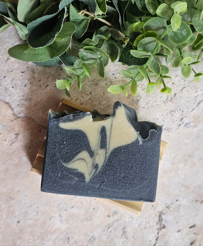 Olive Oil, Palm Oil, Coconut Oil, Water, Sodium Hydroxide, Shea Butter, Kokum Butter, Castor Oil, Fragrance*, Activated Charcoal, French Green Clay *essential oils(tea tree, rosemary, and litsea cubeba).