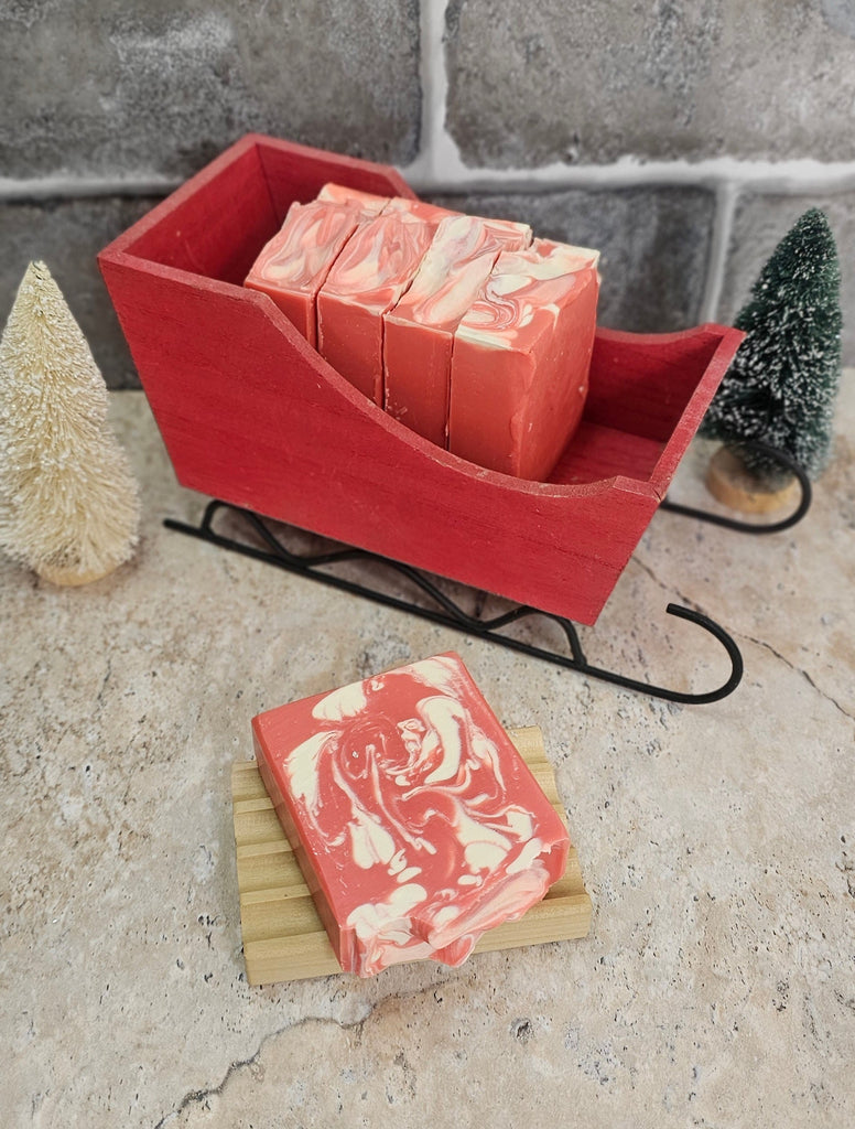 Olive Oil, Sustainable Palm Oil, Coconut Oil, Water, Sodium Hydroxide, Kokum Butter, Shea Butter, Castor Oil, Fragrance Oil, Kaolin Clay, Mica(egg yolk in Fireside Nog)